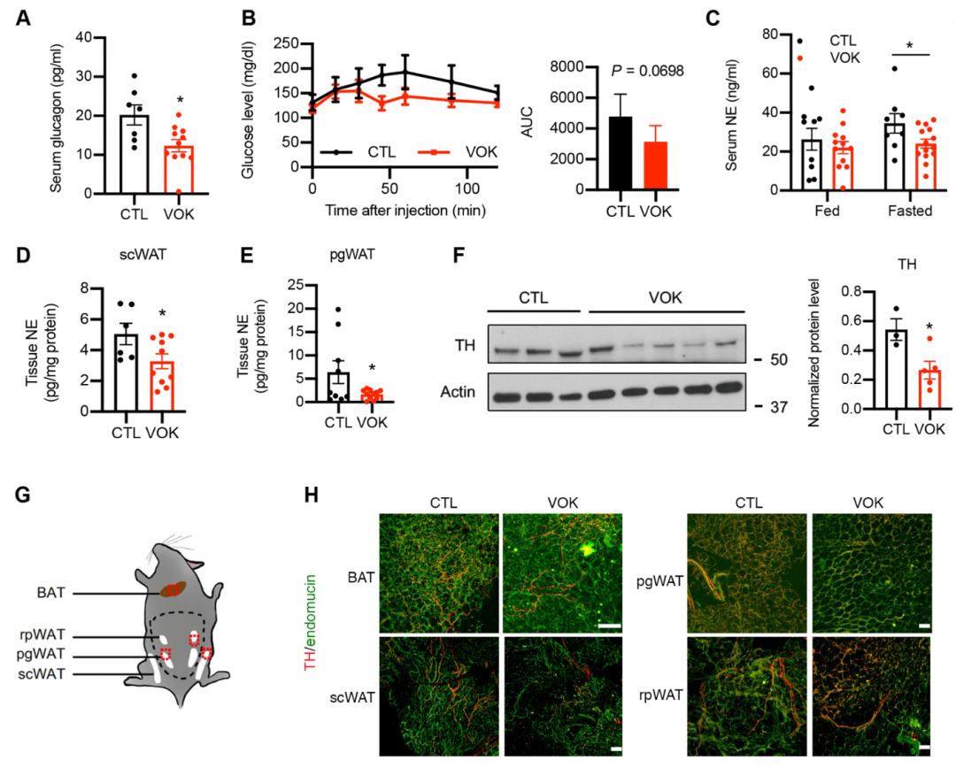 另外,研究人员发现,在禁食15小时后,VOK小鼠比CTL小鼠有较低的血清胰高血糖素水平,并且与在注射2-脱氧葡萄糖来模拟葡萄糖剥夺后的结果一致,可以得出OGT是维持反调节反应所必需的。除此之外,禁食15小时后,VOK 小鼠具有较低的去甲肾上腺素,表明 VOK 小鼠与CTL小鼠相比,交感神经系统活性有所减少。其中,VOK 小鼠在白色脂肪组织中表现出分散的交感神经支配和较低的交感神经密度,这揭示了OGT 是维持白色脂肪组织的交感神经活动和交感神经支配所必需的。