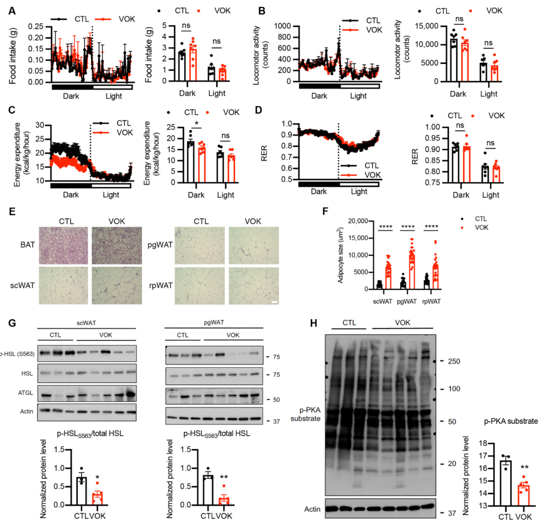 为了进一步确定OGT缺失小鼠肥胖的原因,研究人员对VOK小鼠与CTL小鼠的代谢进行研究。他们发现在食物摄入和体力活动方面,二者没有差别,但VOK小鼠在黑暗周期中有较低的能量消耗。另外,研究人员发现在白色脂肪组织中参与分解脂肪的磷酸化HSL蛋白水平下调以及PKA活性降低,这表明典型脂肪分解途径在VOK小鼠的白色脂肪组织中被下调,即揭示了VOK小鼠肥胖的原因。