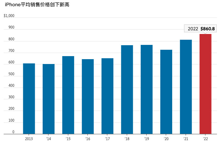 这一策略帮助苹果从每笔手机销售中获得了更多收入。数据分析平台Visible Alpha提供的数据显示,根据分析师们的一致预期,自iPhone 13发布以来的三个季度里,苹果共售出了1.892亿部iPhone。iPhone的同期收入约为1630亿美元,平均售价约为861美元,创下历史新高,比首款Pro机型推出前的2019财年的平均售价高出12%。
