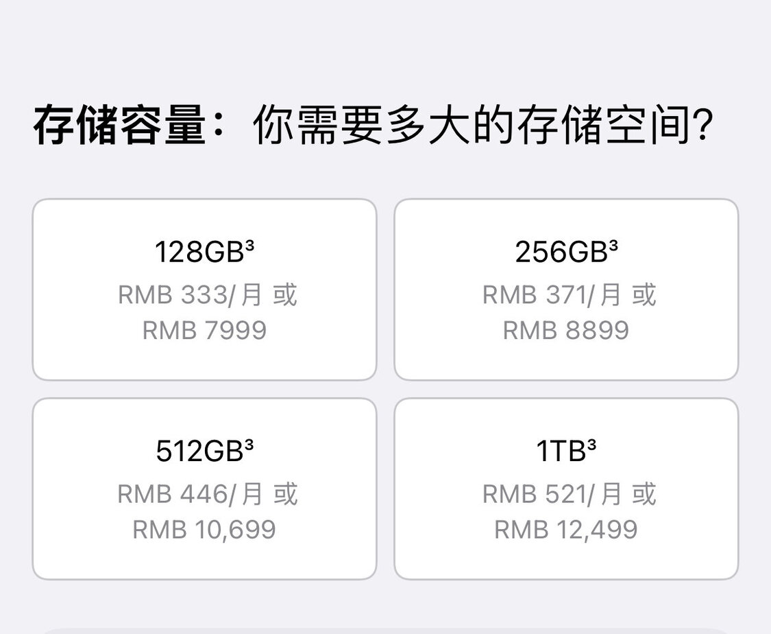根据苹果的配置设计,同一款机型拥有多个存储空间选择,容量越大价格越高。以iPhone 14 Pro为例,从128GB升级到256GB需要加价900元,从128GB升级到最高的1TB需要加价4500元。