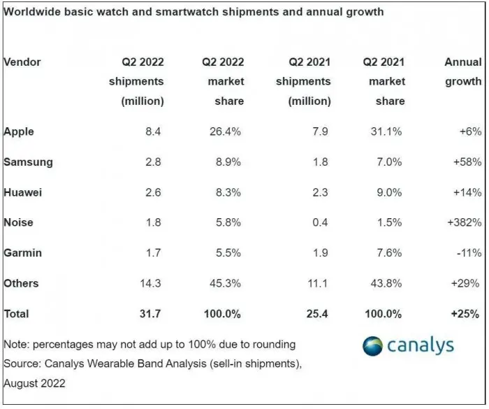 苹果出货量最大,出货量为 840 万块,占市场份额的 26.4%。三星以 280 万台的出货量领先华为位居第二,而华为则为 260 万台。