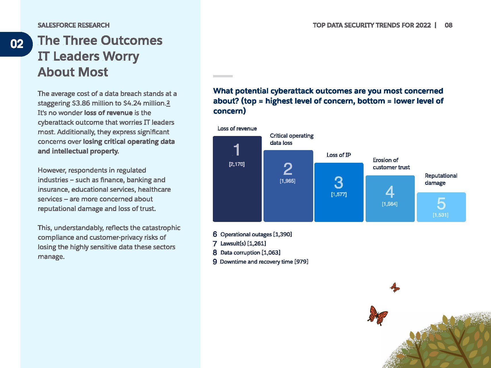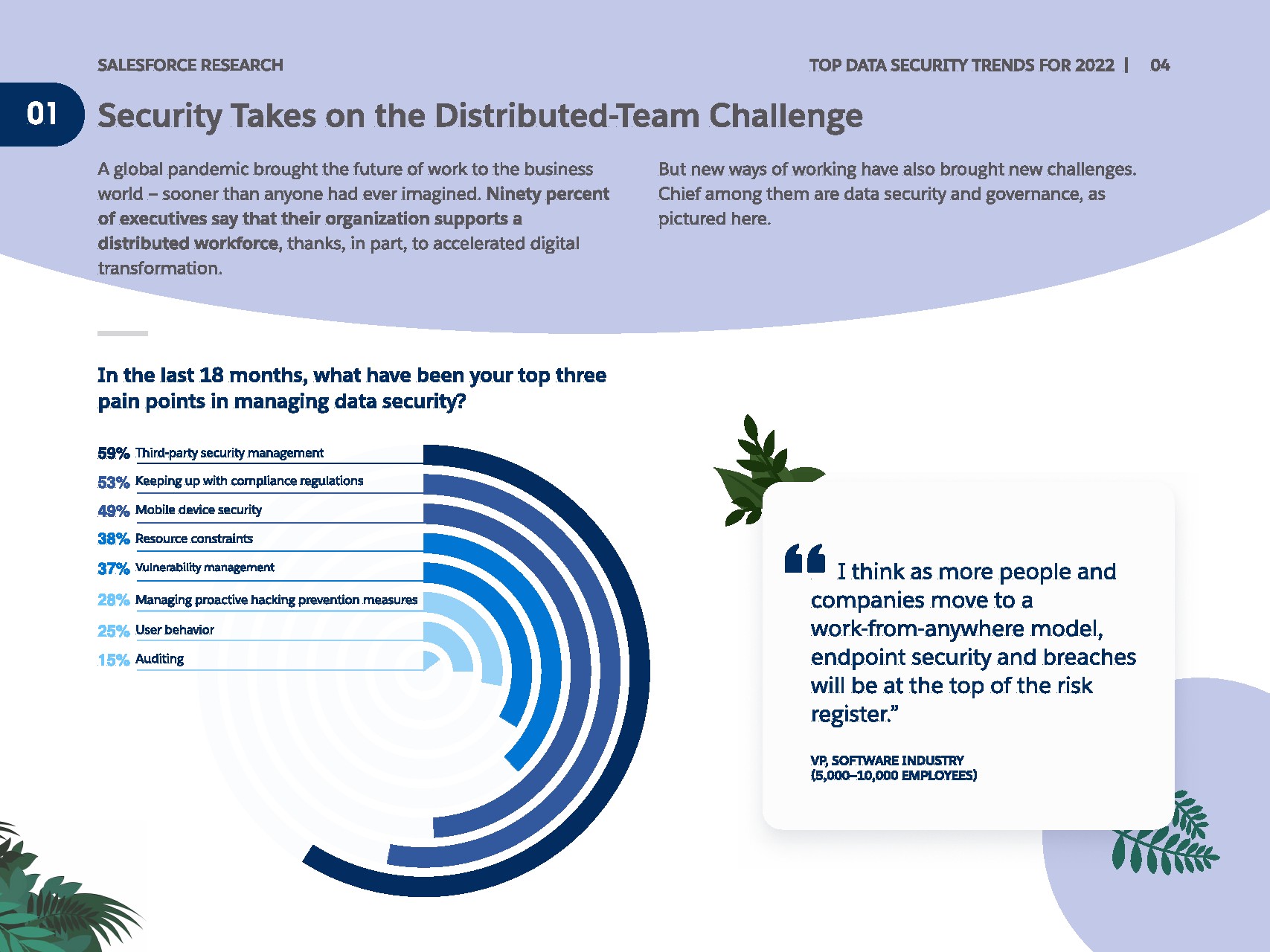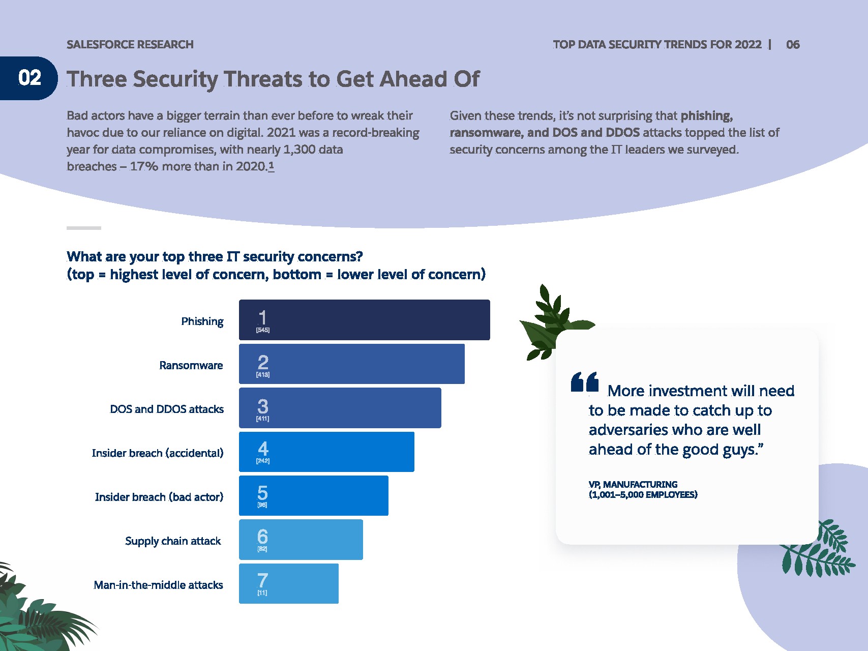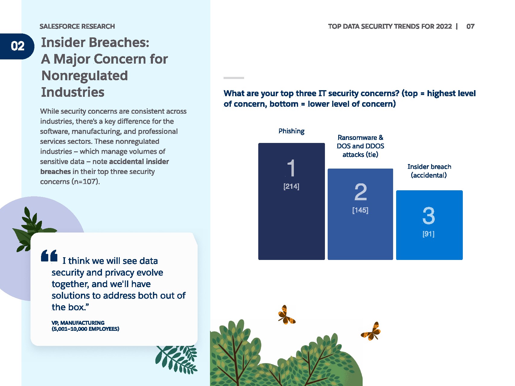 持续的威胁继续使数据安全成为不可预测的,而且往往是危险的导航领域。 IT领导者最关心网络钓鱼、勒索软件和DOS/DDOS攻击。但软件、制造和专业服务行业的受访者指出,内部违规是他们最关心的三大问题之一。