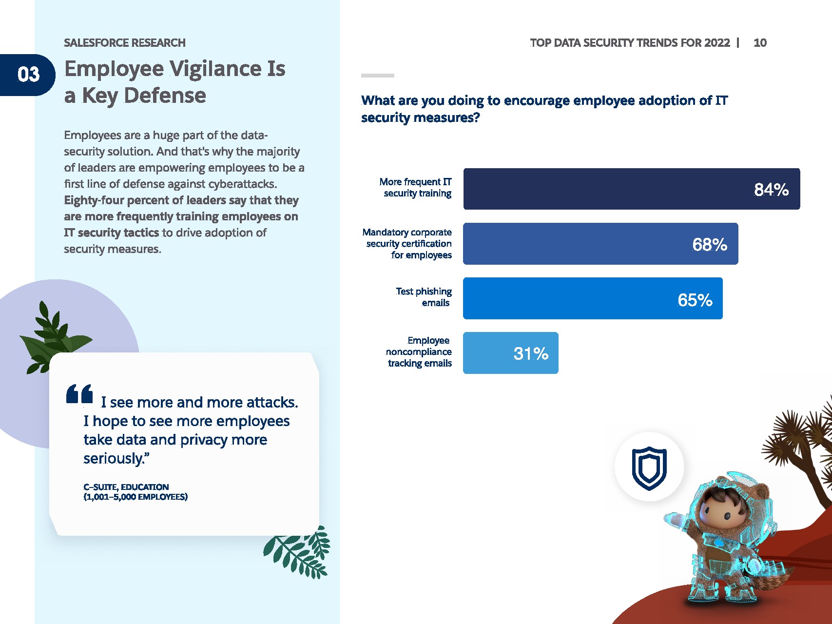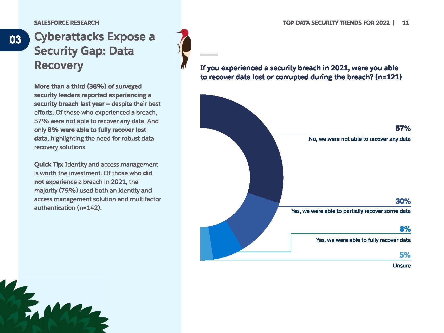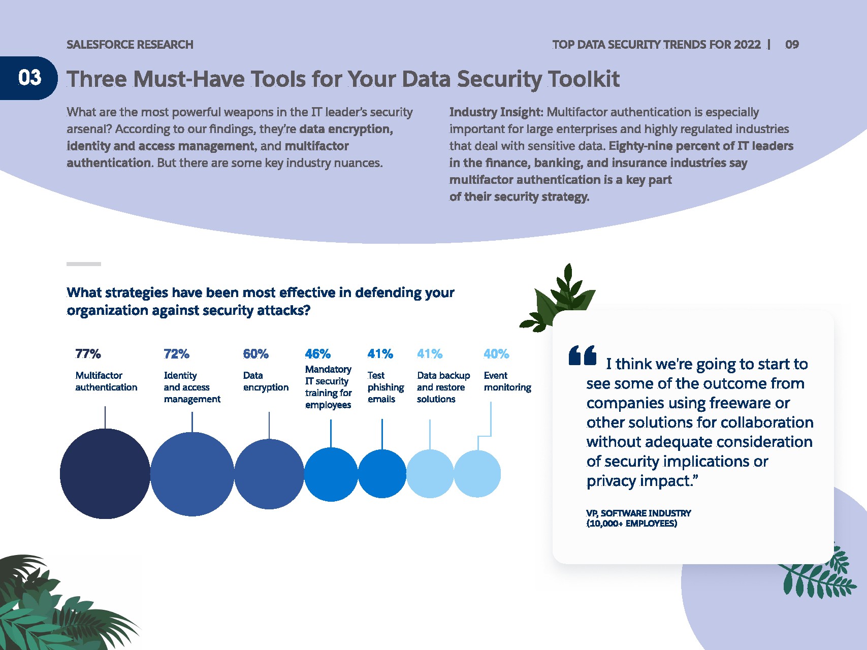 IT领导者经常将员工作为抵御攻击的第一道防线。除了员工警惕之外,77%的人将多因素身份验证报告为最重要的安全策略。身份访问管理紧随其后,72%的人将其视为最佳实践。令人惊讶的是,IT领导者的安全库中存在一个明显的差距:备份和恢复解决方案。只有41%的人表示这是其安全策略的核心组成部分。