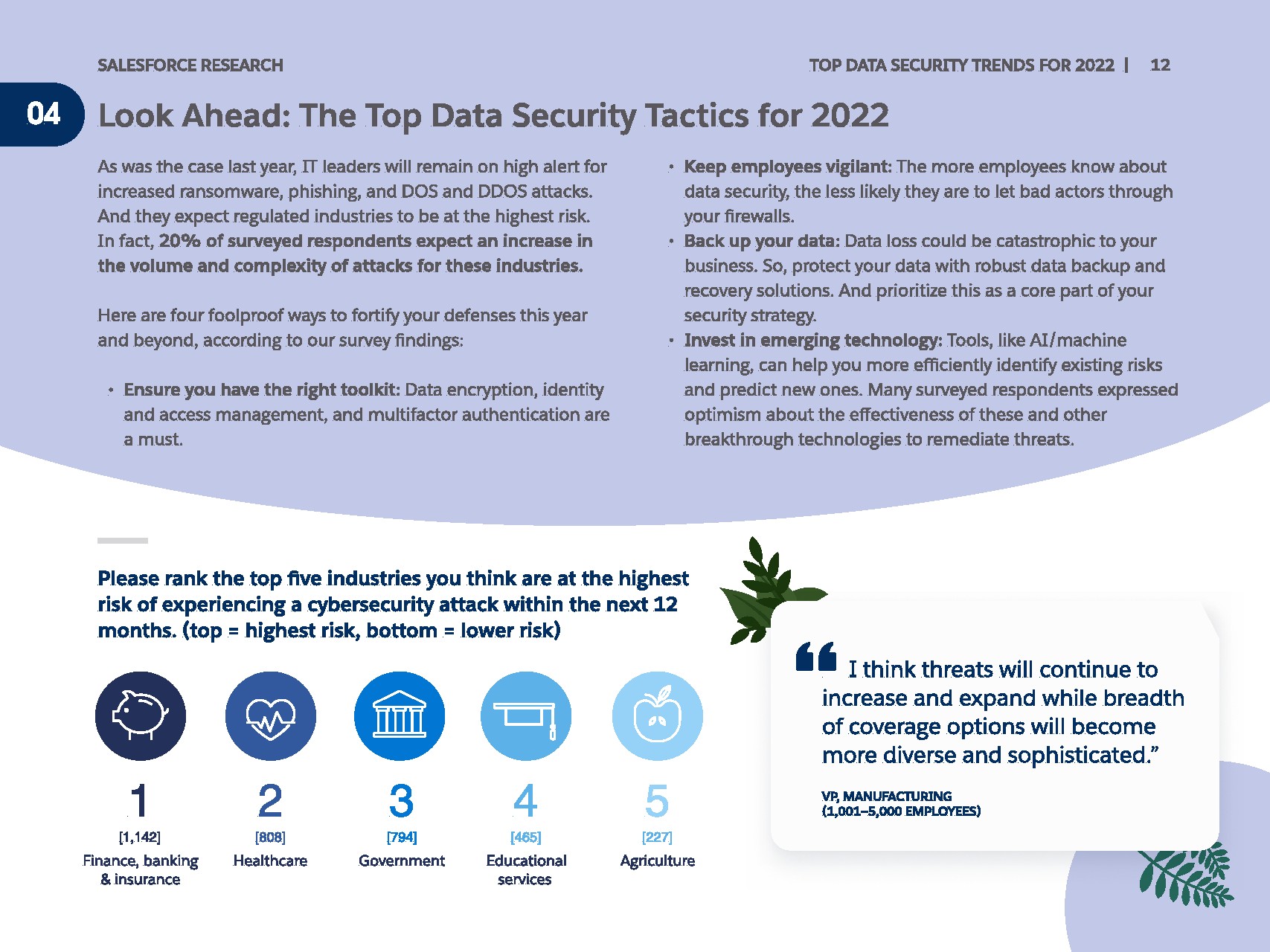 大多数人预测,威胁将在今年继续肆虐。全面的IT领导者预计金融、政府和医疗保健部门将成为网络攻击的最大目标。但是,定性反馈表明希望有更多更好的工具来预测和消除威胁。