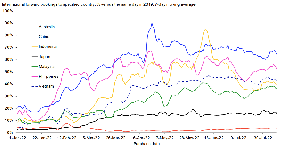 当澳大利亚政府决定向游客重新开放时,前往该国的国际旅行预订量从大流行前的57%增长至90%。同样在印度尼西亚,由于今年1月取消旅行限制,预订量已达到2019年的84%。自2月以来,出于商务和旅游目的的游客可以无签证进入菲律宾,使该国的国际预订量迅速上升至大流行前的50%左右。另一方面,中国和日本对国际游客和交通几乎完全关闭,这一情况与该地区最近的发展形成鲜明对比。