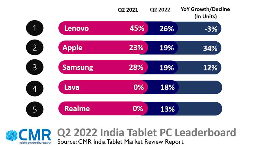 根据CMR 2022年第二季度平板电脑市场报告,印度平板电脑市场同比增长68%,4G平板电脑同比增长65%。