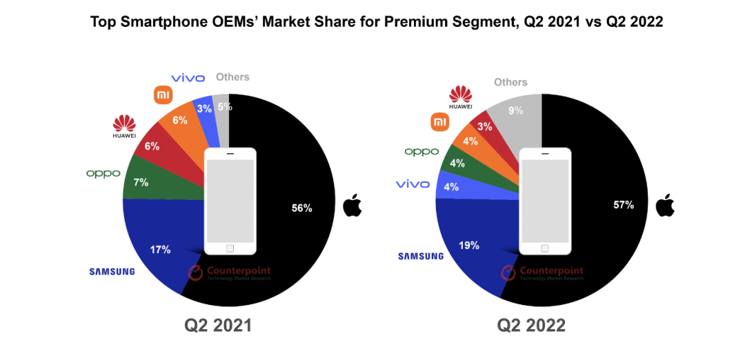 就销量而言,2022年Q2高端细分市场的销售额同比下降8%,但表现优于整体智能手机市场,后者下降了12%。这是高端市场连续第九个季度表现优于智能手机市场的整体增长。