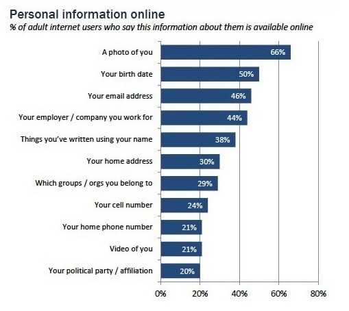 报告称,当前约有50%用户担忧自己的个人信息在网上被检索到,这些个人信息包括照片、视频、电子邮件地址、出生日期、电话号码、家庭地址和所属群体。而在2009年时,这一数据仅为30%。