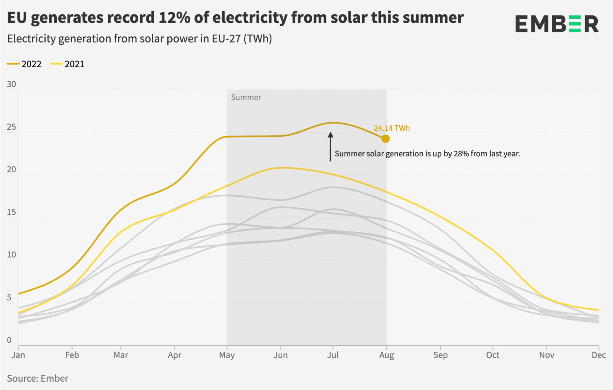 当前欧洲面临严重的能源危机,天然气、水电和核电的供应都不充足,唯有太阳能发电一枝独秀,在夏季的几个月里创下了新纪录。根据英国环境智库Ember的研究,整个欧洲大陆的晴朗炎热天气和太阳能装置的增加促成了太阳能在欧盟创纪录的发电量,比去年夏天高出28%。