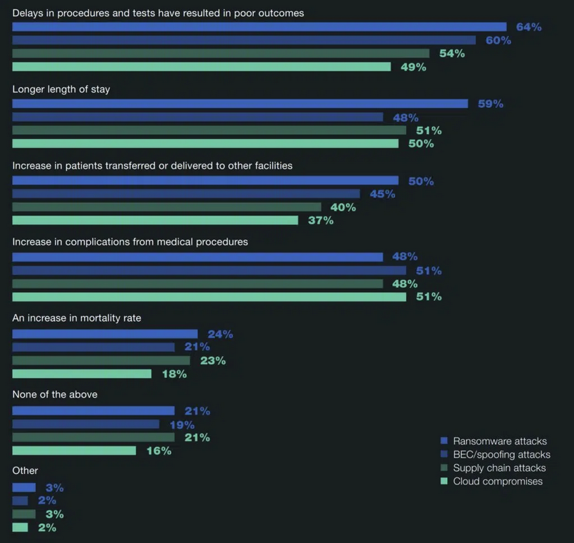 最有可能对病人护理产生负面影响的攻击类型是勒索软件,导致64%的机构的程序或测试延迟,59%的机构的病人住院时间延长。