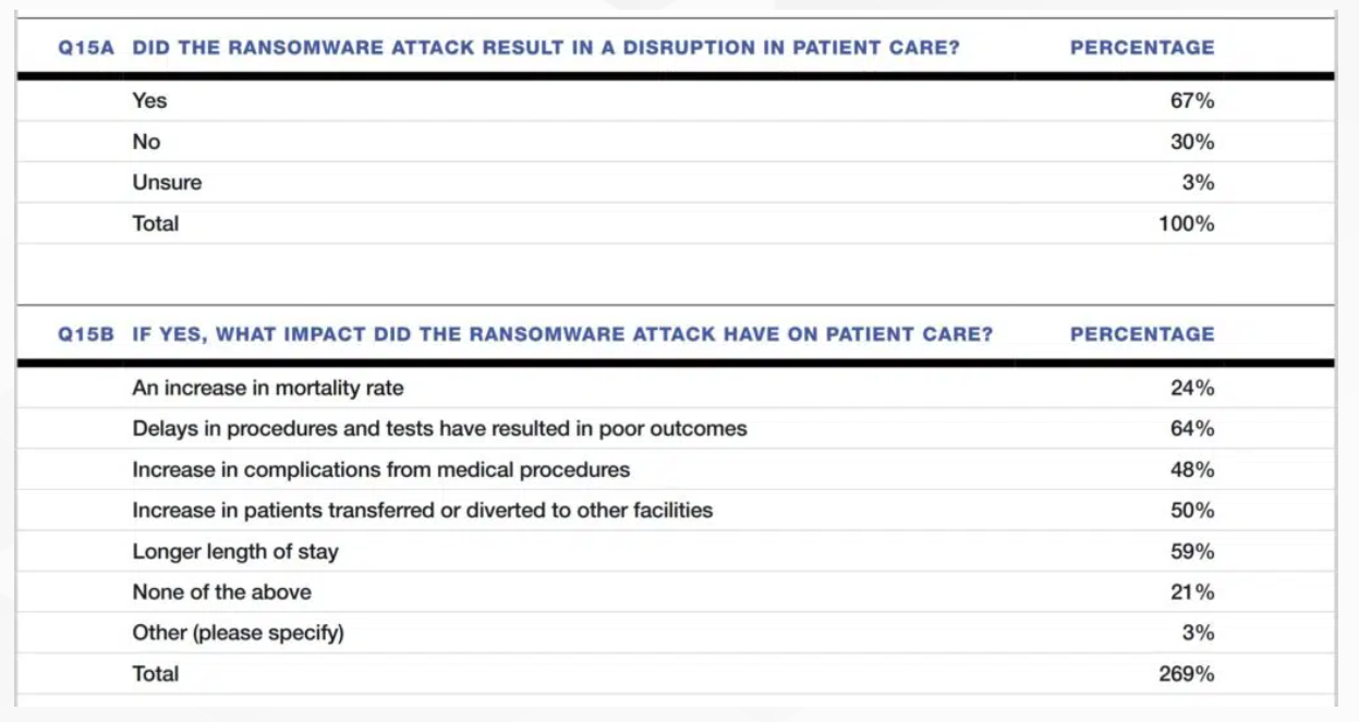 Ponemon的报告附带了一个提示,即这些数字取决于自我报告的准确性,因此不具备诸如流行病学研究的分量,即研究攻击前后的医院死亡率基线数据,但这些数据与Ponemon去年发现的数据相似,而且已经有一些关于勒索软件攻击造成病人死亡和其他并发症的报告。