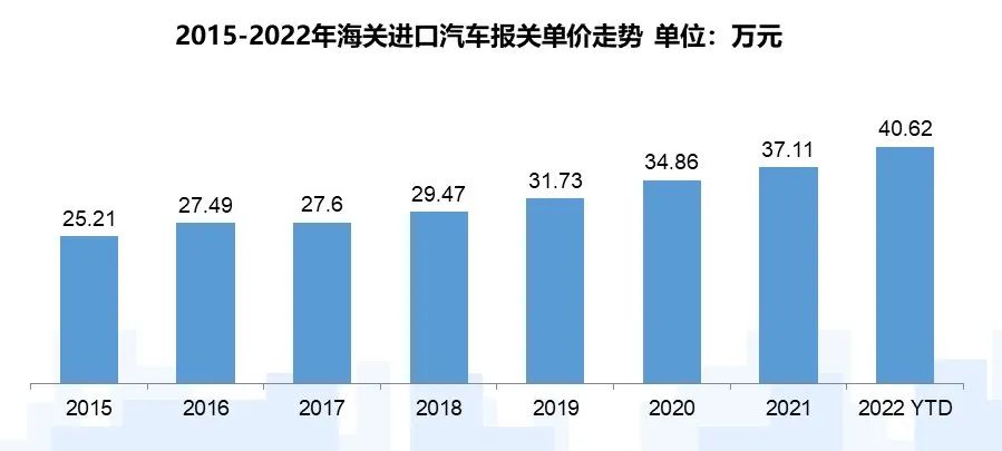 进口汽车报关单价逐年提升,从2015年到2022年,进口汽车报关单价从25.21万元提升到40.6万元,突破40万元大关,一是消费升级趋势,二是低价产品国产化趋势,三是汇率近期有所贬值。