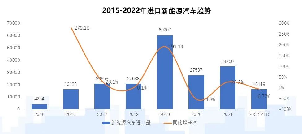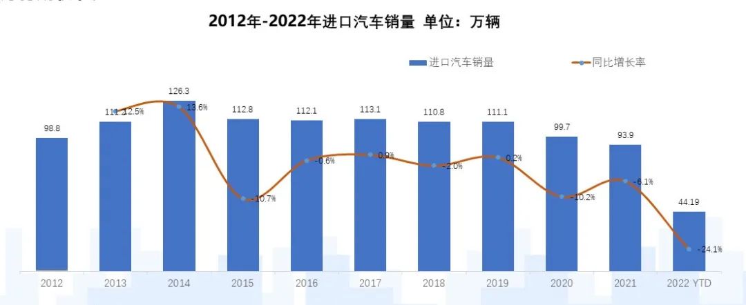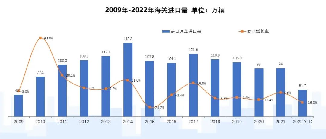 汽车进口量历经三年的下滑后,2021年微增长,2022年再次进入负增长,1-7月进口51.7万辆,下滑16%;进口金额达到2100.1亿元,同比下降2.7%。