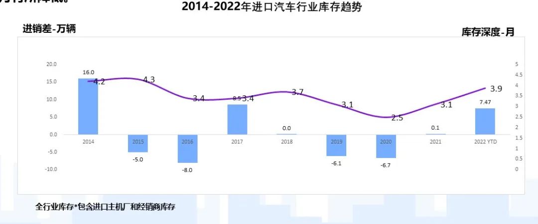 伴随着19-20年供给小于需求,进口汽车全行业库存深度出现明显下滑;2021年供需基本平衡,但销量有所下滑;截至2022年7月库存深度大幅攀升至3.9个月,创历史新高,但相比6月有所降低。