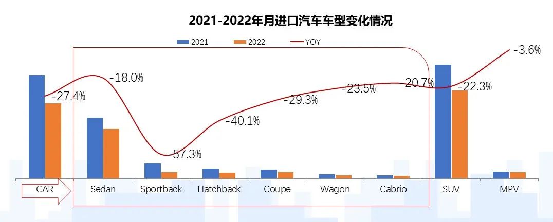 2022年1-7月,三大车型均出现不同程度的下滑,MPV降幅最低,轿车和SUV同比下滑均超过20%,轿车中小众车型sportback和Hatchback车型同比降幅大于整体市场,超过40%。
