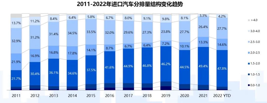 1.5-2.0L排量区间占比为47.8%,相比2021年有所下滑,但仍保持第一大排量区间;2.5-3.0L排量区间相比2021年有所提升,是第二大排量区间;平行进口车型逐步恢复供应,3.0L以上排量份额反弹至5.3%。