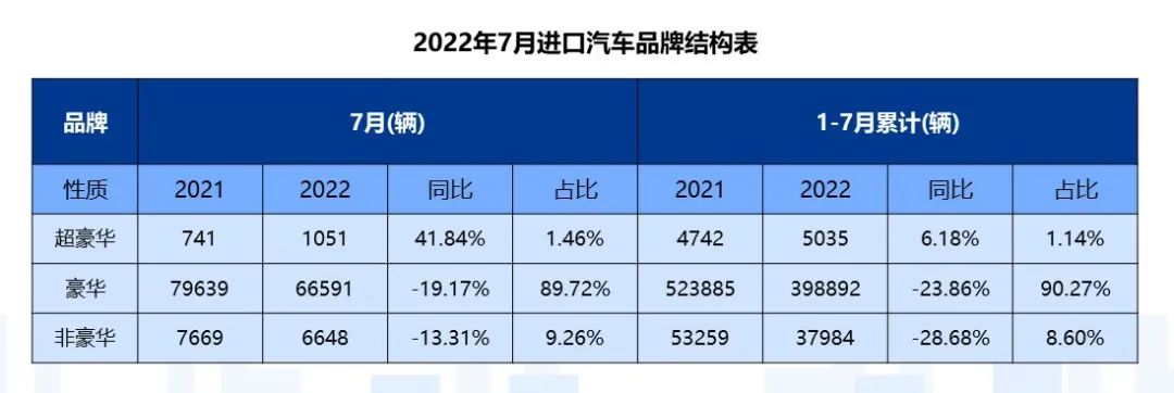 受疫情的影响,进口汽车市场整体大幅下滑,超豪华车、豪华车更加受到消费者的追捧,超豪华汽车本月同比增长41.84%大幅提升。从1-7月累计来看,豪华仍然是销量主力,车占比超过90%以上