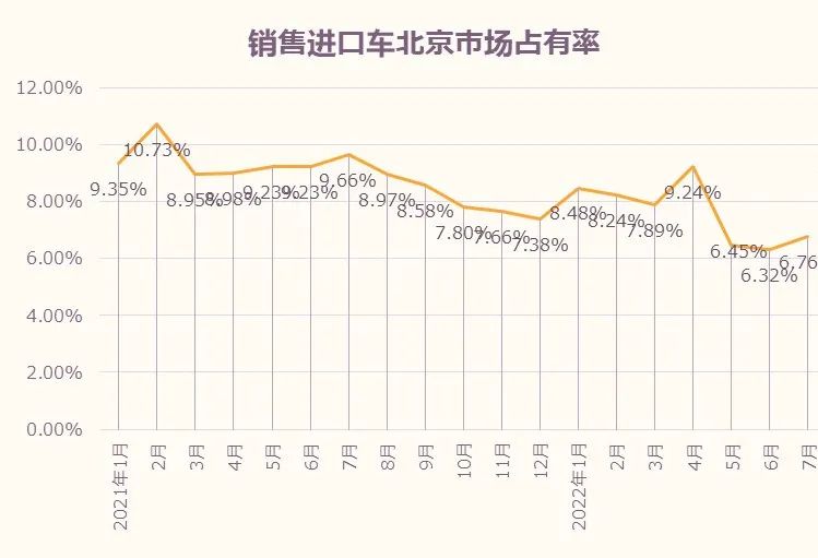 - 1-7月份北京进口车累计销量占北京新车交易总量7.59%。