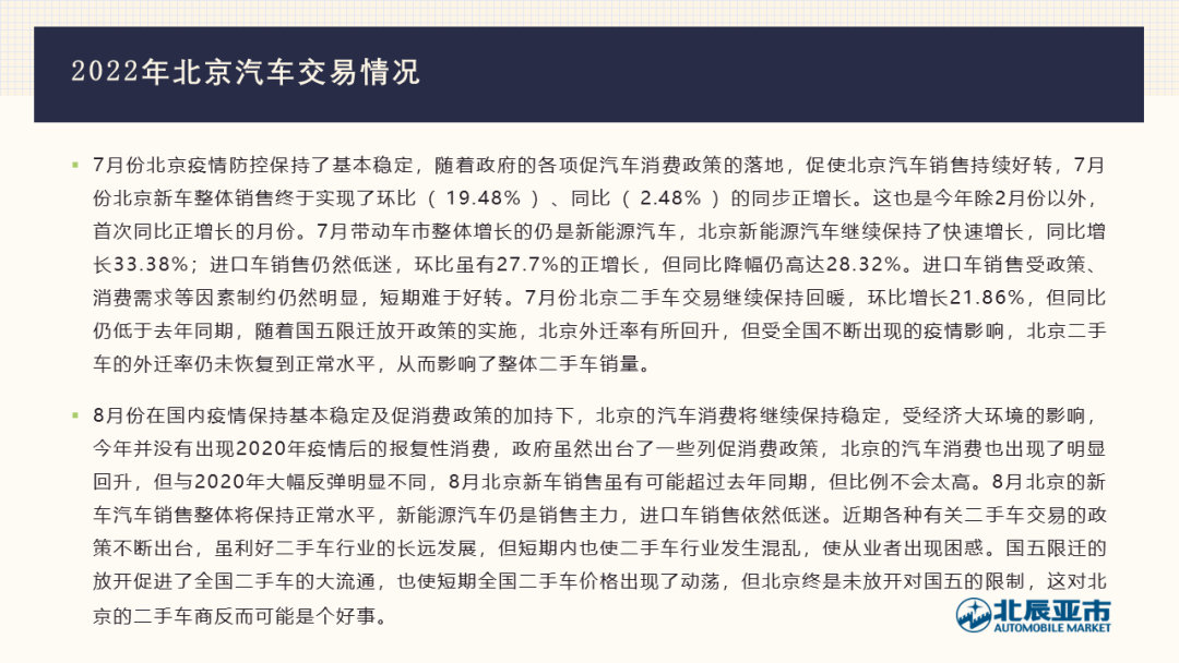 - 1-7月北京市二手车累计成交过户32.8万辆次,同比下降18%,新旧车比为1:1.036。