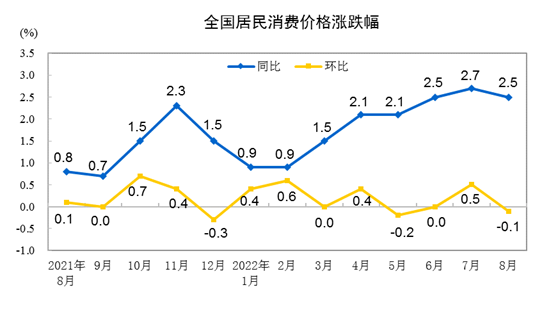 2022年8月份,全国居民消费价格同比上涨2.5%。其中,城市上涨2.4%,农村上涨2.7%;食品价格上涨6.1%,非食品价格上涨1.7%;消费品价格上涨3.7%,服务价格上涨0.7%。1—8月平均,全国居民消费价格比上年同期上涨1.9%。