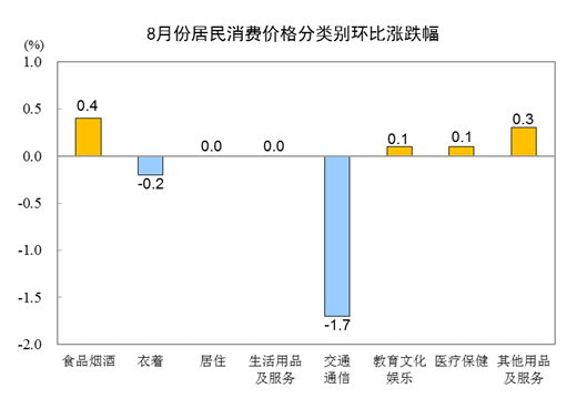 8月份,食品烟酒类价格环比上涨0.4%,影响CPI上涨约0.10个百分点。食品中,蛋类价格上涨3.1%,影响CPI上涨约0.02个百分点;鲜菜价格上涨2.0%,影响CPI上涨约0.04个百分点;畜肉类价格上涨0.6%,影响CPI上涨约0.02个百分点,其中猪肉价格上涨0.4%,影响CPI上涨约0.01个百分点;鲜果价格下降1.0%,影响CPI下降约0.02个百分点。
