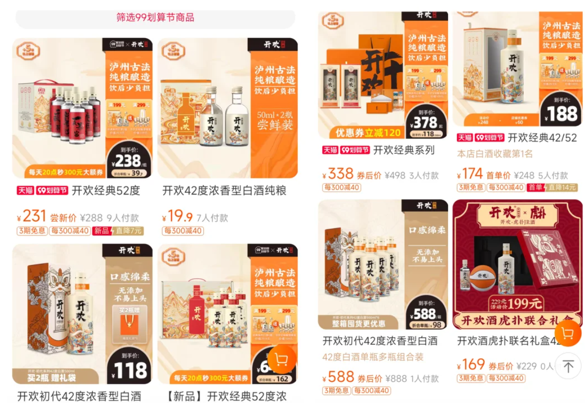 怪兽充电曾借助数百万个充电宝带来的线下流量,打造私域,孵化白酒品牌“开欢”,推出从19.9元的平价酱香白酒,和接近600元的宴席浓香白酒,并开设了天猫旗舰店。但如今看来成果有限,目前店铺粉丝仅24319人,月销量普遍在个位数;