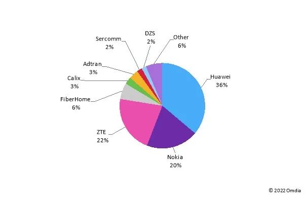 在2022 年一季度,全球光纤和铜缆接入设备收入总计 24 亿美元,较2021 年四季度下降 17%,但较 2021 年一季度增长 19%。全球对 10G PON 网络的投资仍在继续。从2021年二季度—2022 年一季度四个季度的总收入来看,华为以 36% 的市场份额主导全球 PON 设备市场,中兴通讯以 22% 紧随其后,接着是占据20% 市场份额的诺基亚。