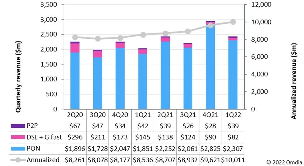 华为和中兴的业绩表现在很大程度上归功于近期中国的 FTTR 热潮。这推动了向 10G OLT 端口(主要是 XG-PON1)以及 GPON ONT/ONU的升级。我们预计,FTTR 升级热潮在中国将延续多个季度,并将在某些国家启动。华为的收入为 7.74 亿美元,同比增长 26%。中兴通讯的全球收入为 5.42亿美元,同比增长 48%。虽然在 2022 年一季度,诺基亚相比业绩良好的 2021 年四季度出现下滑,但它在本季度依然拥有良好表现——取得了 4.73 亿美元的收入,较2021年一季度增长 19%。