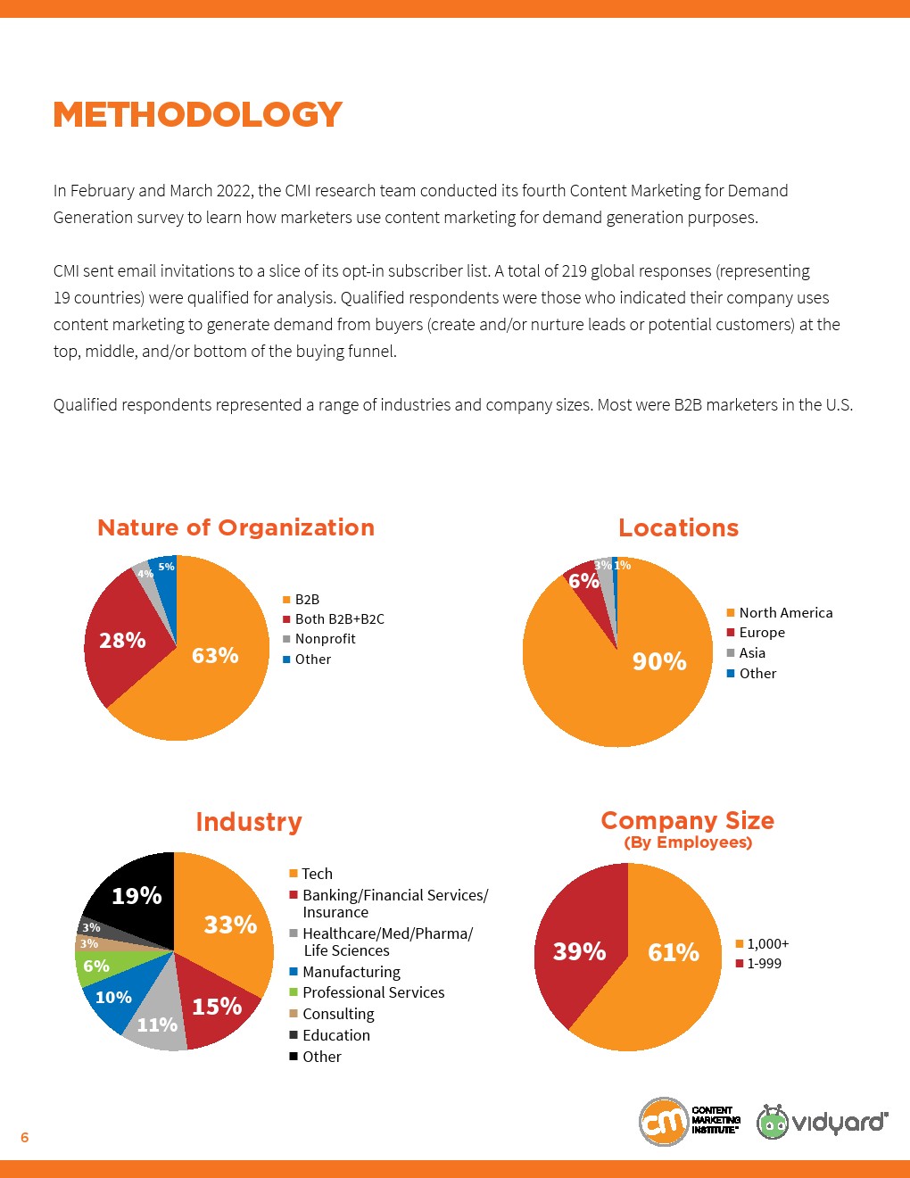 CMI 向一部分订阅者发送了电子邮件邀请。共有219个响应(代表19个国家)符合分析条件。合格的受访者是那些表示他们的公司使用内容营销在购买漏斗的顶部、中间和/或底部产生买家需求(创建和/或培养潜在客户或潜在客户)的人。