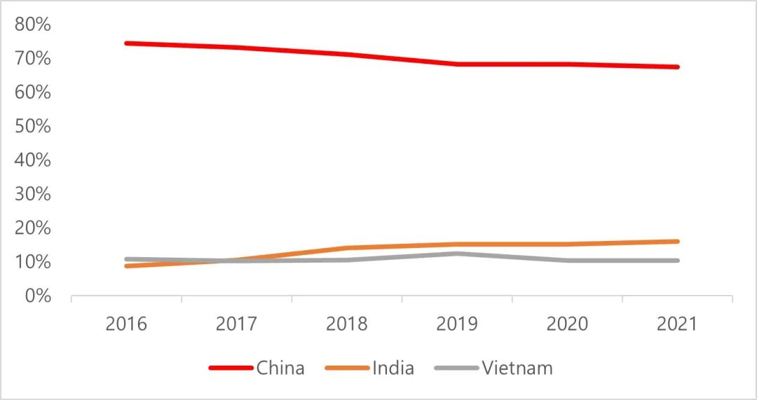 2021 年,越南占全球手机总产量的 10%,与一年前相似。尽管三星在越南增加了产量,但 LG 将其智能手机业务从越南撤出,对本国生产产量有负面影响,导致总产量与去年相比仅略有增加。另外由于苹果正将部分 iPad 生产转移至越南,也可能会将部分 iPhone 的生产转移至越南,这都会提高该国的整体手机产量。