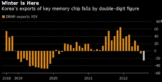 韩国最赚钱存储芯片的出口创下2019年以来最大降幅,表明需求下滑加剧。通商部周五发布的数据显示,8月份动态随机存取存储器(DRAM)出货同比下降24.7%,前一个月为下降7%。DRAM占到韩国存储芯片出口的近一半。