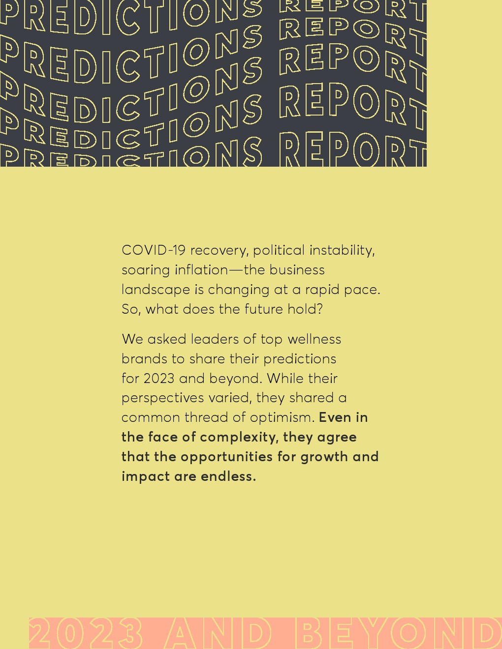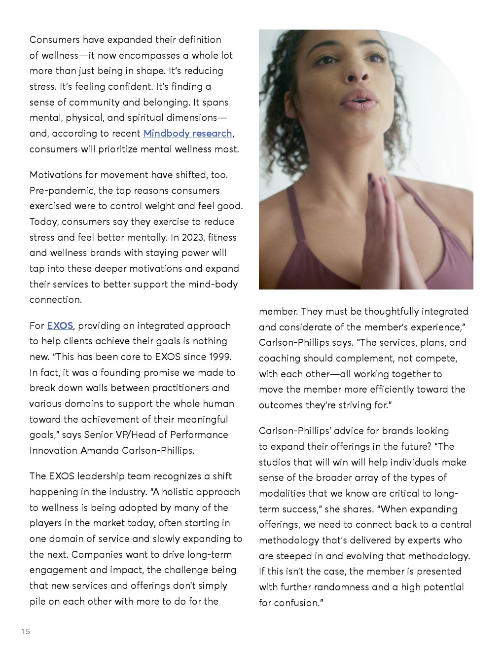 Mindbody发布了“2023年预测报告”。COVID-19 复苏、政治不稳定、通货膨胀飙升导致商业环境正在迅速变化。那么,未来会怎样? Mindbody调查了顶级健康品牌的领导者,分享他们对 2023 年及以后的预测。 虽然他们的观点各不相同,但他们有着共同的乐观态度。 即使面对复杂性,他们也同意增长和影响的机会是无穷无尽的。