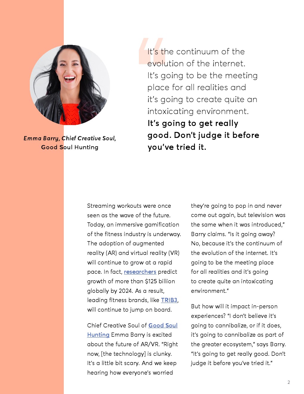 这是互联网发展的连续体。 它将成为所有现实的聚会场所,并将创造一个令人陶醉的环境。研究人员预测,到 2024 年,全球AR和VR收入增长将超过 1250 亿美元。因此,TRIB3 等领先的健身品牌将继续加入。