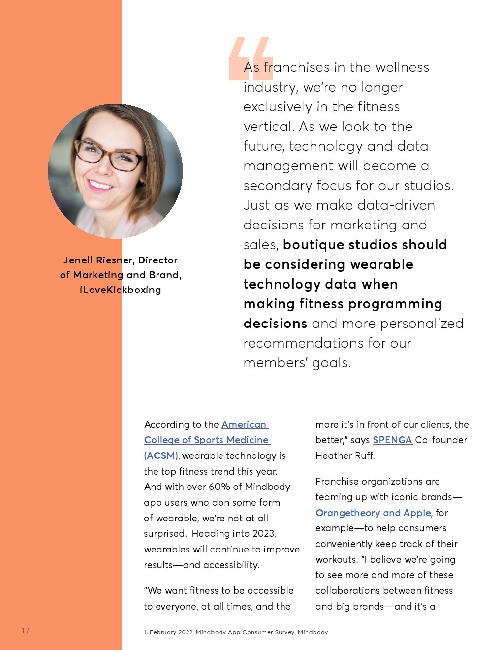 根据美国运动医学学院 (ACSM) 的报道,可穿戴技术是今年最流行的健身趋势。超过 60% 的Mindbody用户使用某种形式的可穿戴设备。