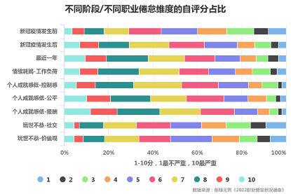 为更好地了解职场人士的职业倦怠现状,前程无忧近日发布了《2022 职业倦怠状况调查》(以下简称《调查》),以职业倦怠的 “情绪耗竭”“个人成就感低” 和“玩世不恭”三个维度为着入点进行探讨。
