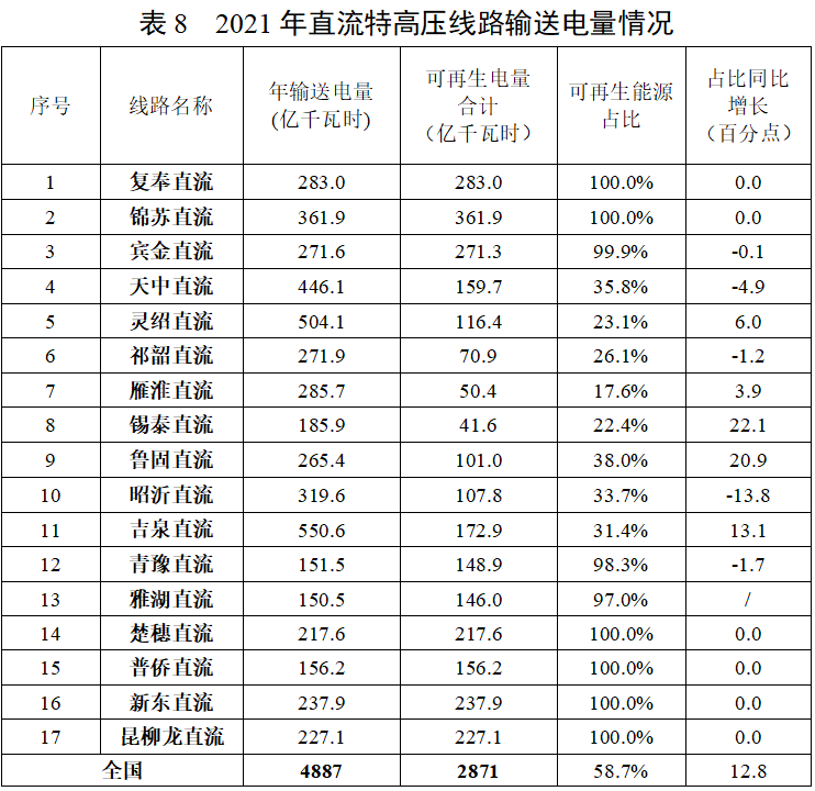2021 年,17 条直流特高压线路年输送电量 4887 亿千瓦时,其中可再生能源电量 2871 亿千瓦时,同比提高 18.3%,可再生能源电量占全部直流特高压线路总输送电量的 58.7%。国家电网运营的 13 条直流特高压线路总输送电量 4048 亿千瓦时,其中可再生能源电量 2032 亿千瓦时,占总输送电量的 50.2%;南方电网运营的 4 条直流特高压线路输送电量 839 亿千瓦时,全部为可再生能源电量。