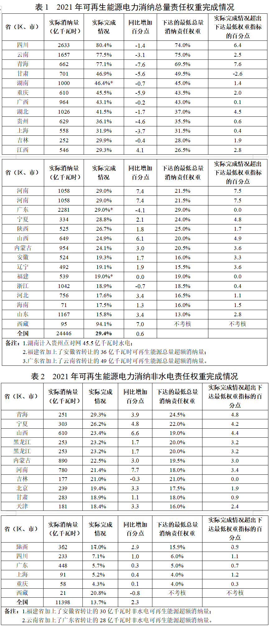根据《国家发展改革委 国家能源局关于 2021 年可再生能源电力消纳责任权重及有关事项的通知》(发改能源〔2021〕704 号)公布的 2021 年各省(自治区、直辖市)可再生能源电力消纳责任权重,综合考虑各省本地生产、本地利用以及外来电力消纳情况,经核算,除西藏免除考核外,全国 28 个省(自治区、直辖市)完成了国家能源主管部门下达的最低总量消纳责任权重,甘肃和新疆可再生能源电力总量消纳实际完成情况较最低消纳责任权重分别低 2.6 个和 1.8 个百分点;全国 29 个省(自治区、直辖市)完成了国家能源主管部门下达的最低非水电消纳责任权重,新疆非水电可再生能源电力消纳实际完成情况较最低消纳责任权重低 0.6 个百分点。