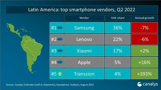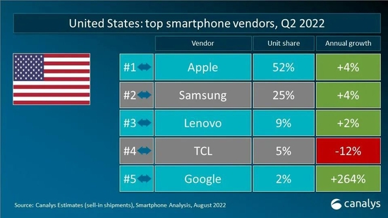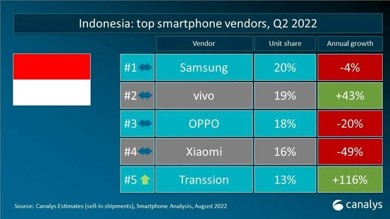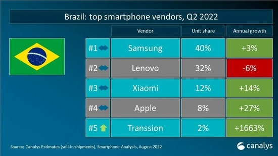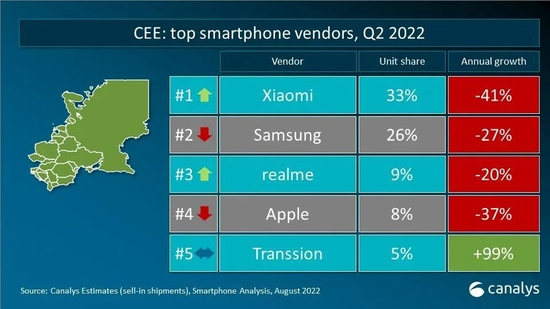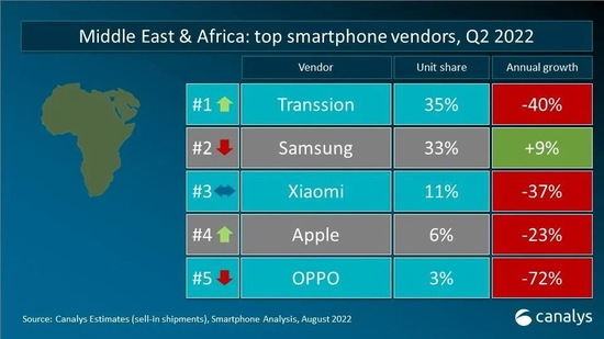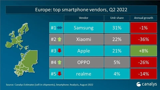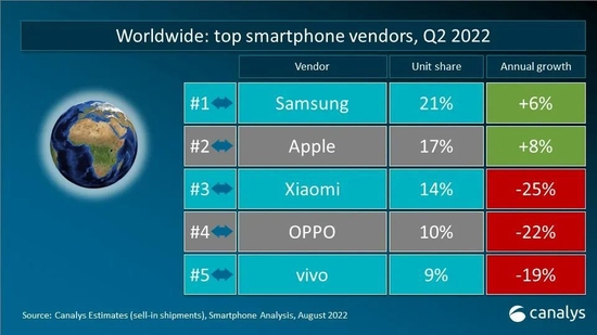 2022年第二季度,全球智能手机出货量减少至2.87亿台,是疫情爆发以来,2020年第二季度后的季度最低点。三星智能手机出货量为6180万台,市场份额占比21%,领跑市场。