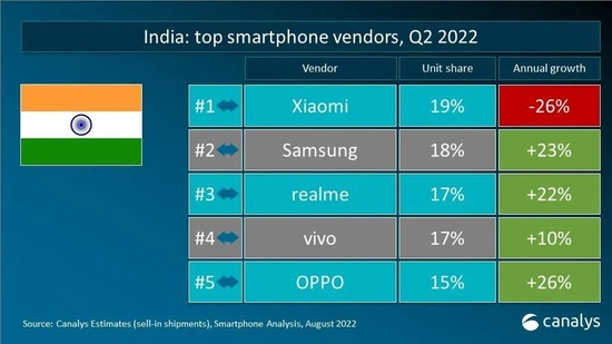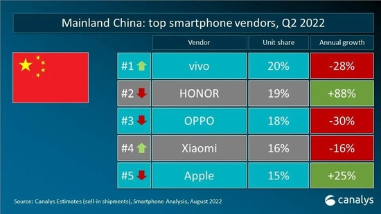 尽管并非苹果的季节性旺季,但苹果智能手机出货量仍然达到4950万台,市场份额占比17%,稳居第二。小米出货量达到3960万台,位列第三,而OPPO和vivo分别以2730万台和2540万台的出货量跻身市场前五。
