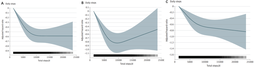 图中曲线很明显,10000步是个“坎儿”(A.B.C依此为步数与全因死亡风险、CVD相关死亡风险、癌症相关死亡风险之间的关系)