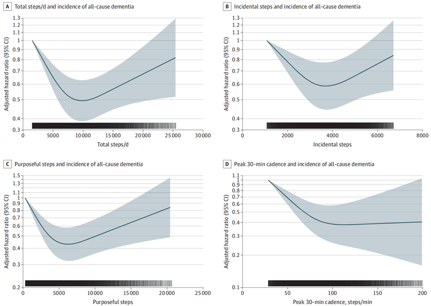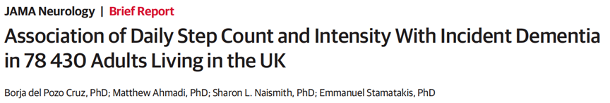 不仅如此,基于这个队列,他们还在另一篇论文中关注了步数、步速与痴呆风险之间的关系。从降低痴呆风险上看,每日最佳步数为9826,与痴呆症风险降低51%相关;如果每天能有30分钟步数达到112步/分钟,则与痴呆风险降低62%相关(不用走至万步)。文章于近日在JAMA Neurology期刊上发表。[2]