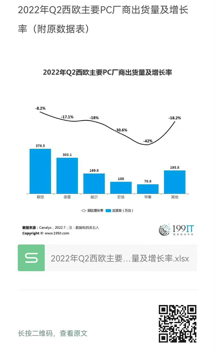 2022年Q2西欧主要PC厂商出货量及增长率(附原数据表) ​​​​