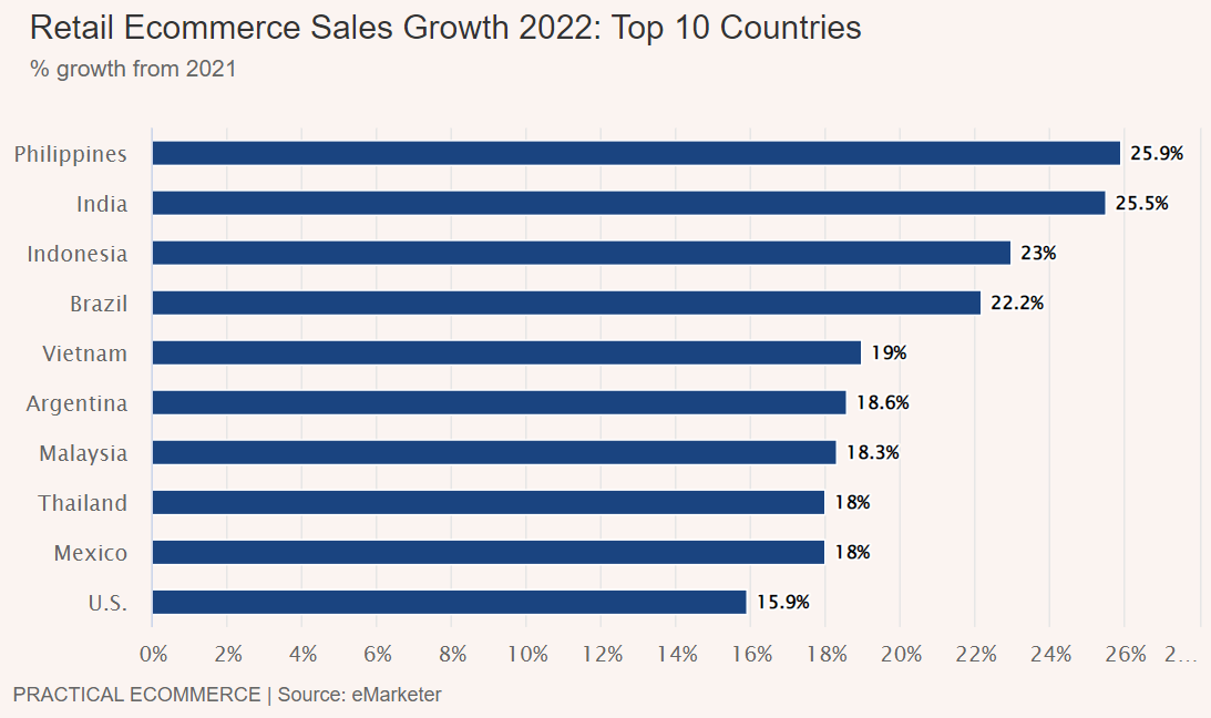 在全球 10 大电商增速最快的市场排名中,东南亚以 5 个名额占据了大半江山,分别为印度尼西亚、马来西亚、菲律宾、泰国和越南。