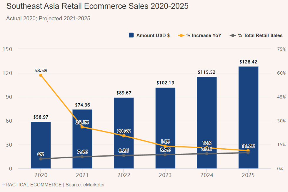 据 eMarketer 预计,东南亚地区 2022 年的电商销售额将增长 20.6%,总计 896.7 亿美元,或将超越其他地区。