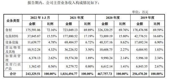 招股书称,公司主要向加盟商销售制作各类现制饮品和现制冰淇淋所需食材、包装材料、设备设施、营运物资等产品并提供加盟管理服务,同时通过直营门店向消费者直接销售现制饮品与现制冰淇淋。食材包括由公司生产主体大咖食品生产加工后再向加盟商销售的食材以及公司自第三方采购后直接对外销售的食材两部分构成。