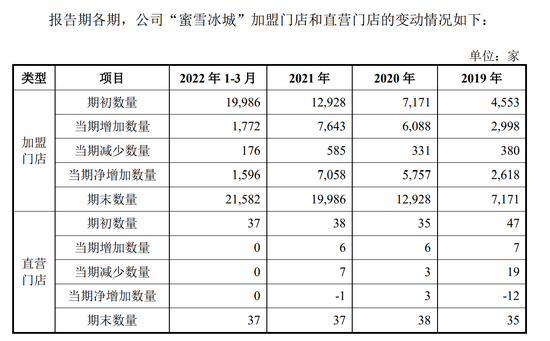 仅“蜜雪冰城”品牌,就从2019年初4553家加盟店,急速扩张至2022年3月末的2万余家加盟店,其中,2020年净增5757家店,2021年净增7058家店,2019年至2021年的门店年复合增长率为68.49%。2022年,仅三个月“蜜雪冰城”就开出了1772家新加盟店。