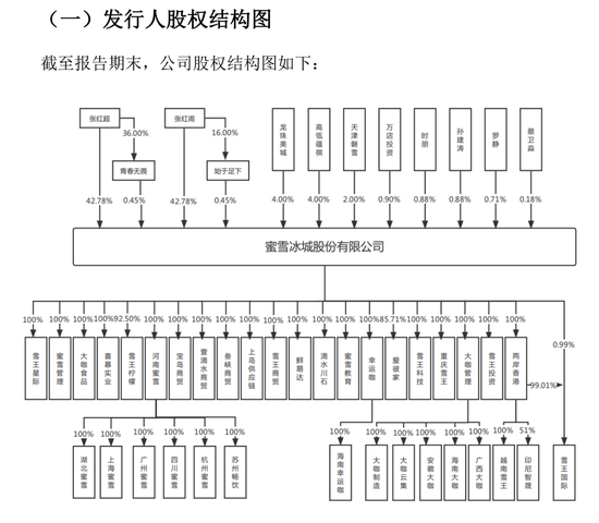 蜜雪冰城创始人张红超任公司董事长、蜜雪冰城全资子公司大咖国际食品有限公司执行董事,其弟张红甫为公司董事、总经理,蜜雪冰城全资子公司河南幸运咖餐饮管理有限公司监事及雪王投资有限责任公司的执行董事。IPO前,两人分别直接持有蜜雪冰城42.78%的股份,合计直接持股85.56%。