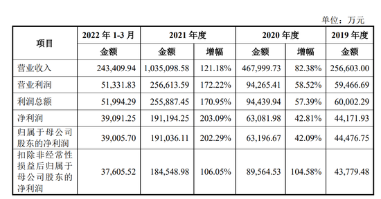 2019年至2021年及2022年1至3月,蜜雪冰城的营收分别为25.66亿元、46.8亿元、103.51亿元及24.34亿元,对应的归属于母公司股东的净利润分别为4.45亿元、6.32亿元、19.1亿元与3.9亿元。
