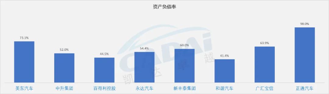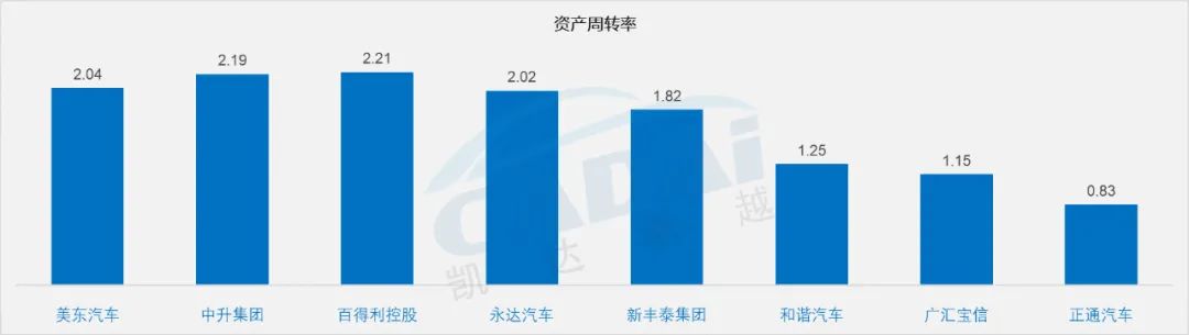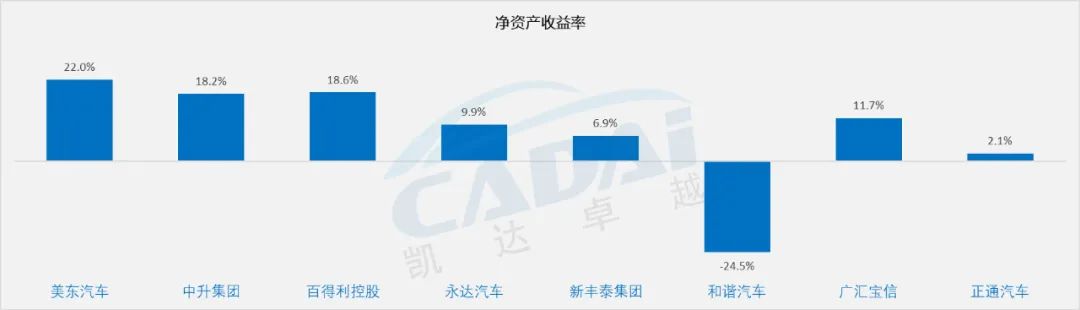 这里可以看出,港股上市的几家公司,和谐汽车由于2022年上半年有拜腾汽车的投资项目产生的计提,从而有所亏损;正通汽车由于历史原因,还处于恢复阶段,所以净资产收益率很低;美东、中升和百得利相比其它经销商集团,净资产收益率处于领先水平。