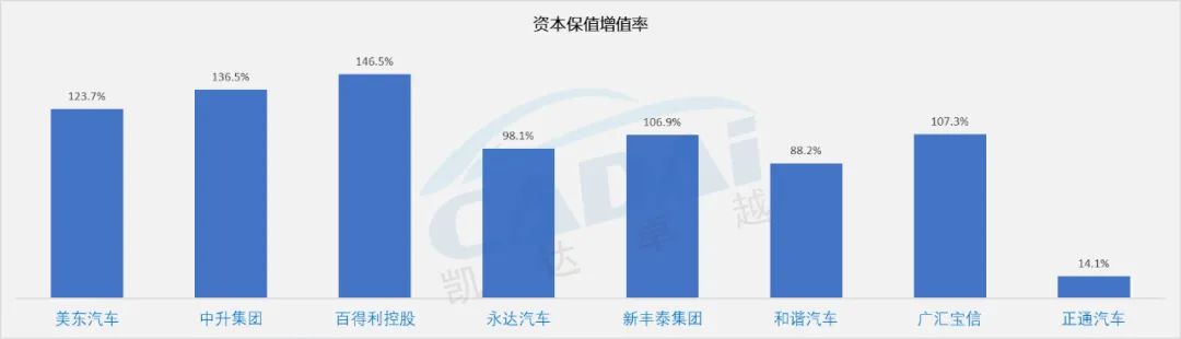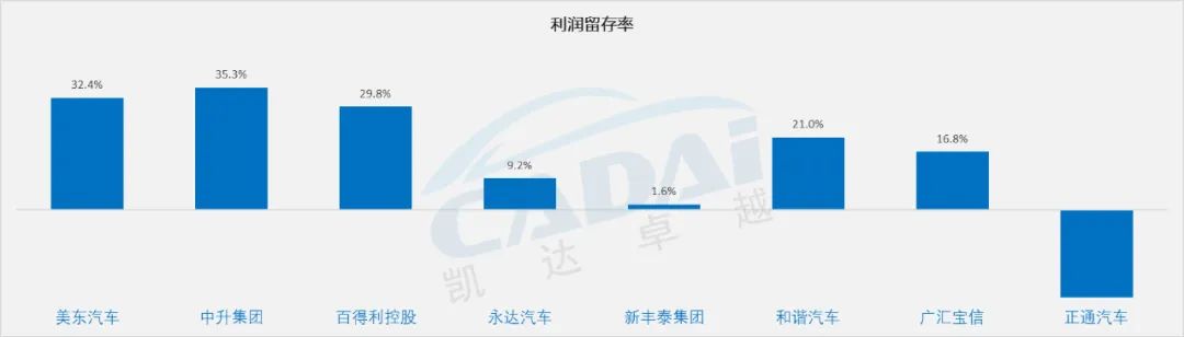 这里正通汽车由于历史原因,经营费用超过经营毛利,所以该指标为负。其它经销商集团,利润留存率差别非常大。经销商集团在费用管控上的水平,体现了业务精细化运作的能力,需要引起投资人的高度关注。